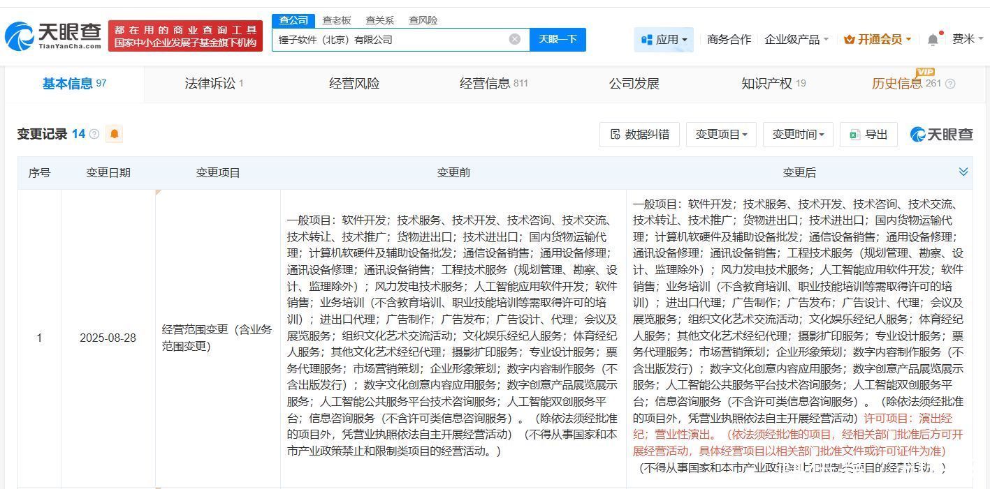 天眼查工商信息显示,近日港联证券港联证券,锤子软件(北京)有限公司发生工商变更,经营范围新增演出经纪、营业性演出。