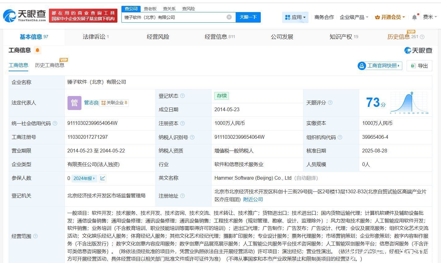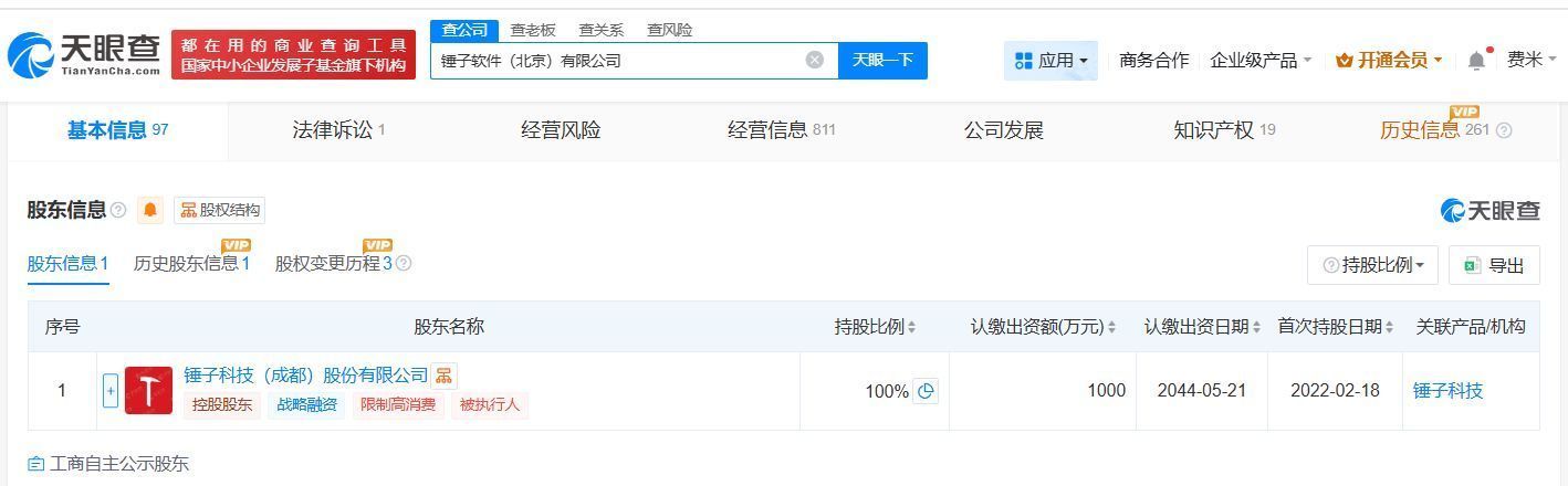 锤子软件(北京)有限公司成立于2014年5月,法定代表人为管志良,注册资本1000万人民币,股东信息显示,该公司由锤子科技(成都)股份有限公司全资持股。