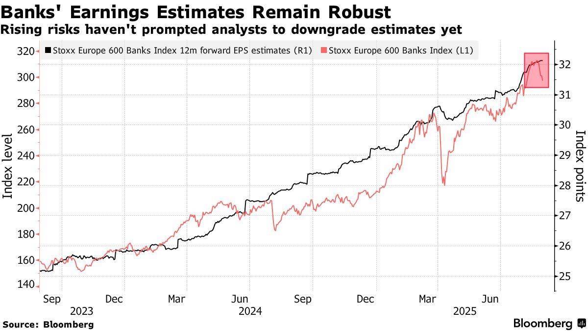 欧洲银行股这波回调正在考验该板块自2009年以来表现最强劲的一年。2025年,得益于亮眼的盈利表现和稳健的投资回报,欧洲银行指数上涨41%,在该地区各板块中轻松拔得头筹。据Bloomberg Intelligence的数据,MSCI欧洲金融指数成份股在第二季度的盈利表现大幅超出分析师预期,每股收益增长15%,远超市场原本预计的仅增长2%。